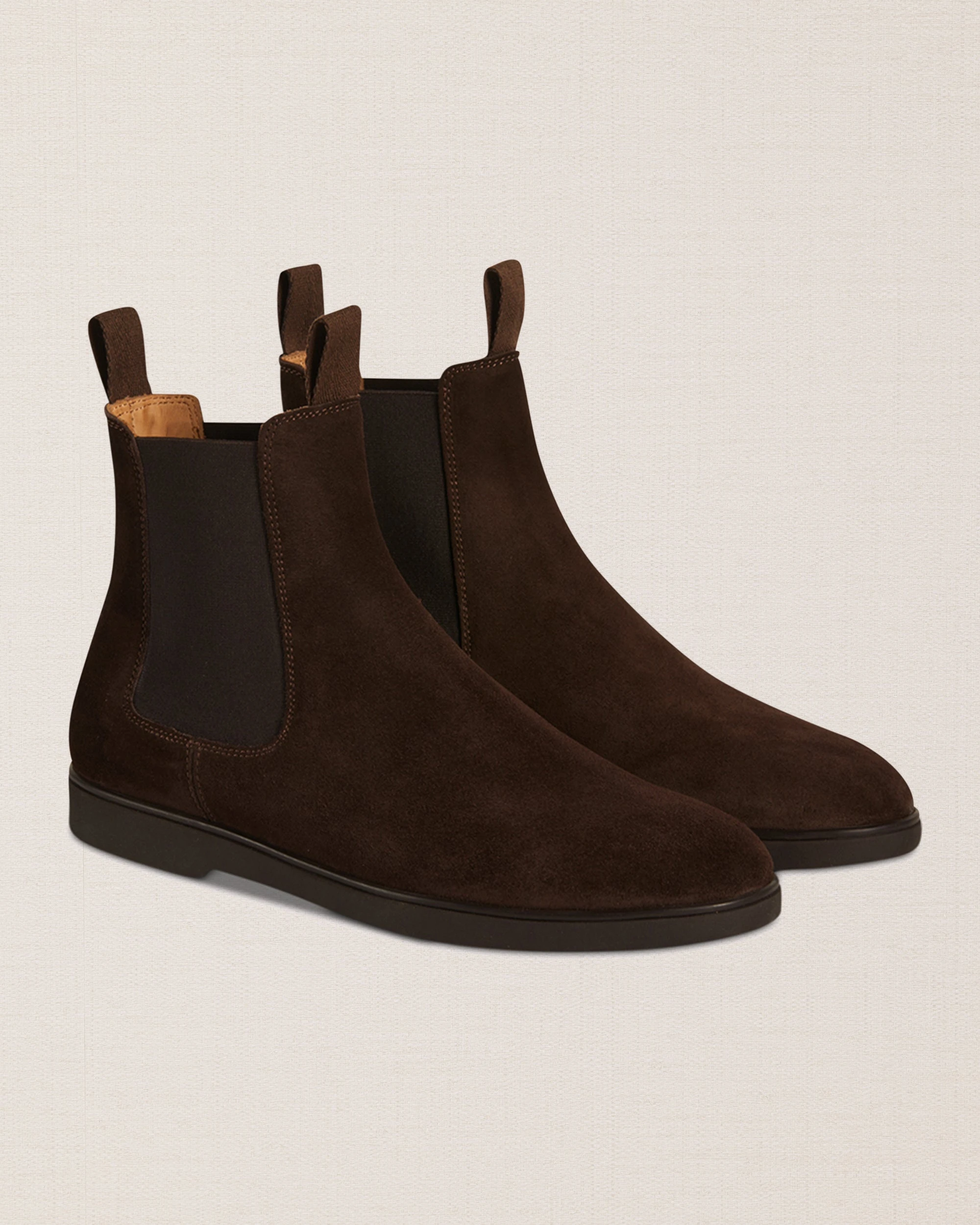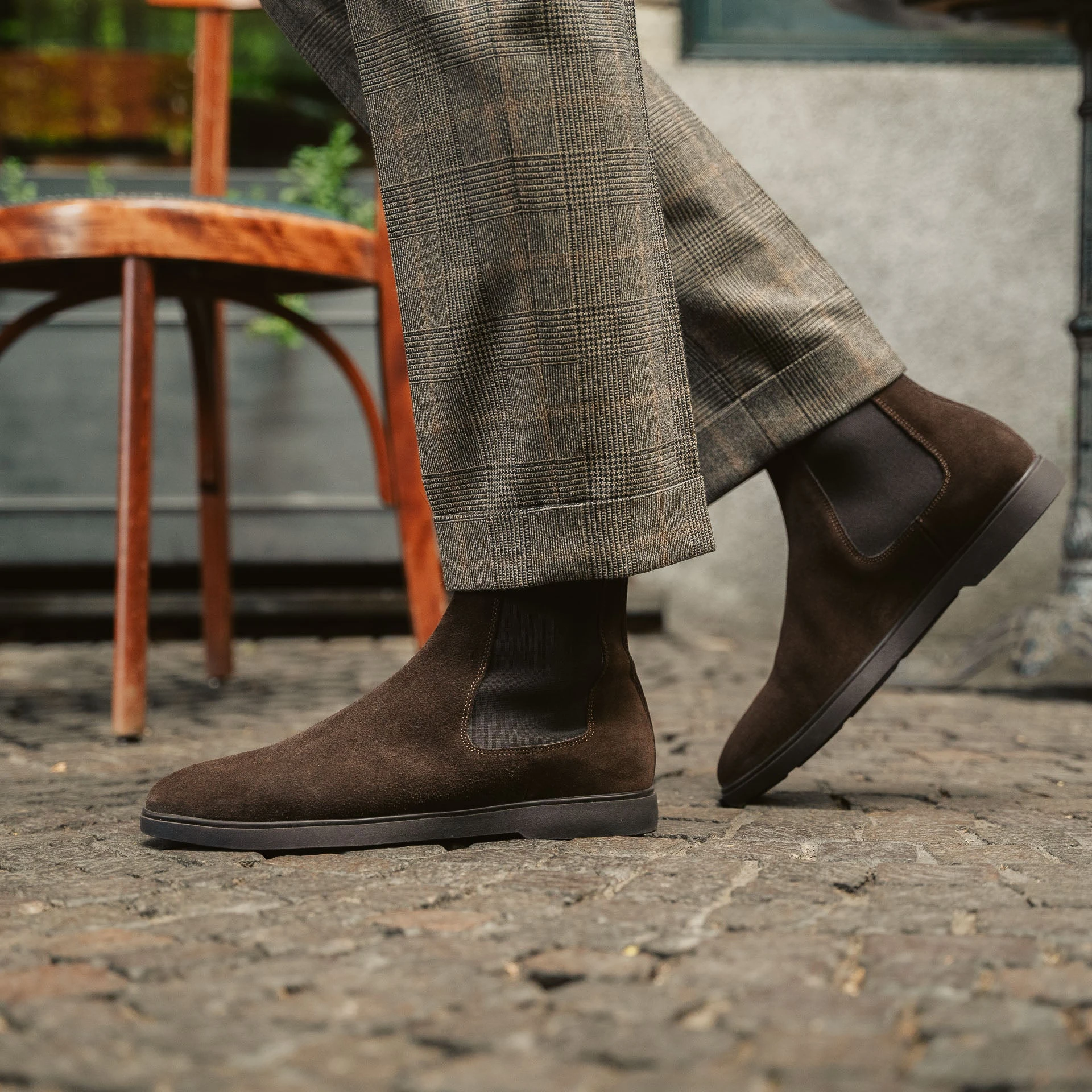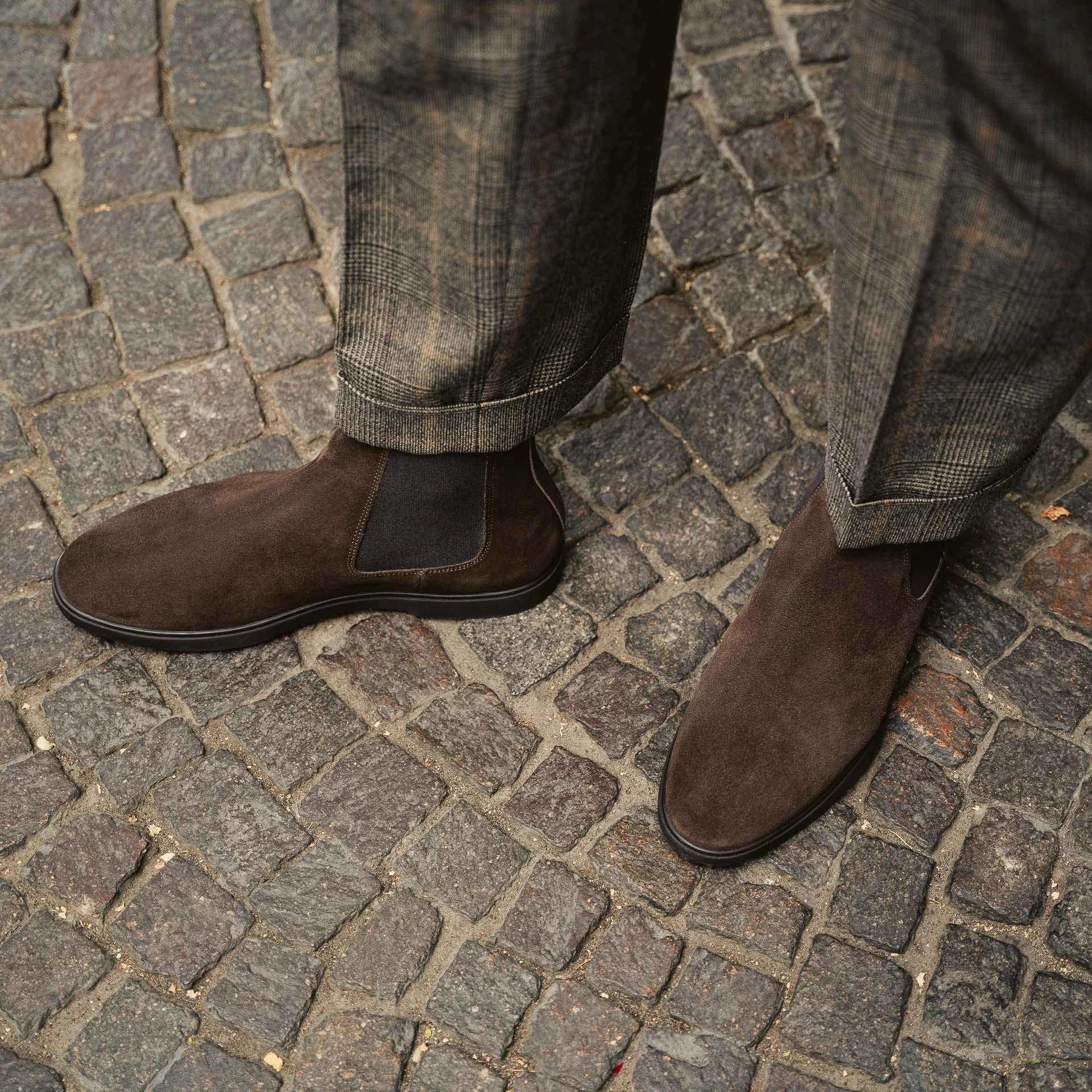 The [sbrand] Classic Suede Chelsea Boots are the iconic choice for any man who values both style and practicality. Made from luxurious suede leather and featuring a durable rubber sole with ridges, these boots are designed for walking on any surface without slipping. Perfectly versatile, they pair just as well with a suit as they do with casual attire. We styled them with a double-breasted jacket and Prince of Wales flannel pleated trousers for a refined yet casual look.