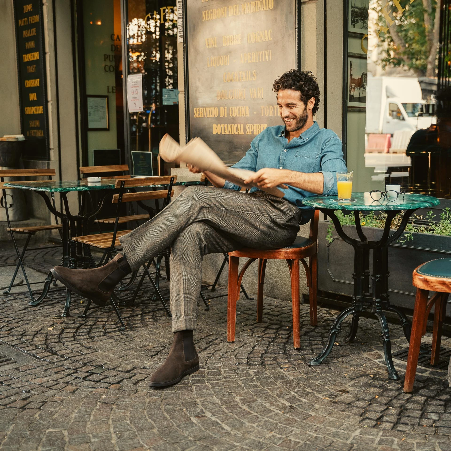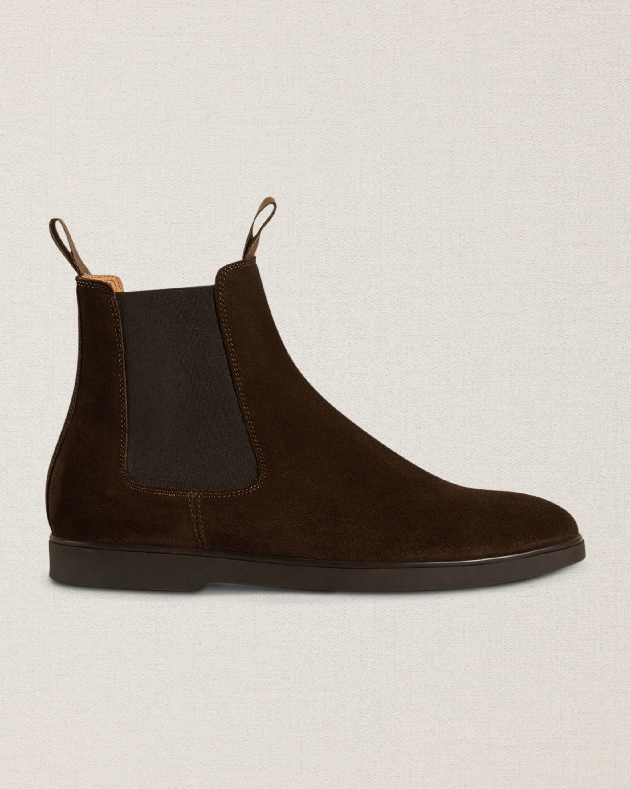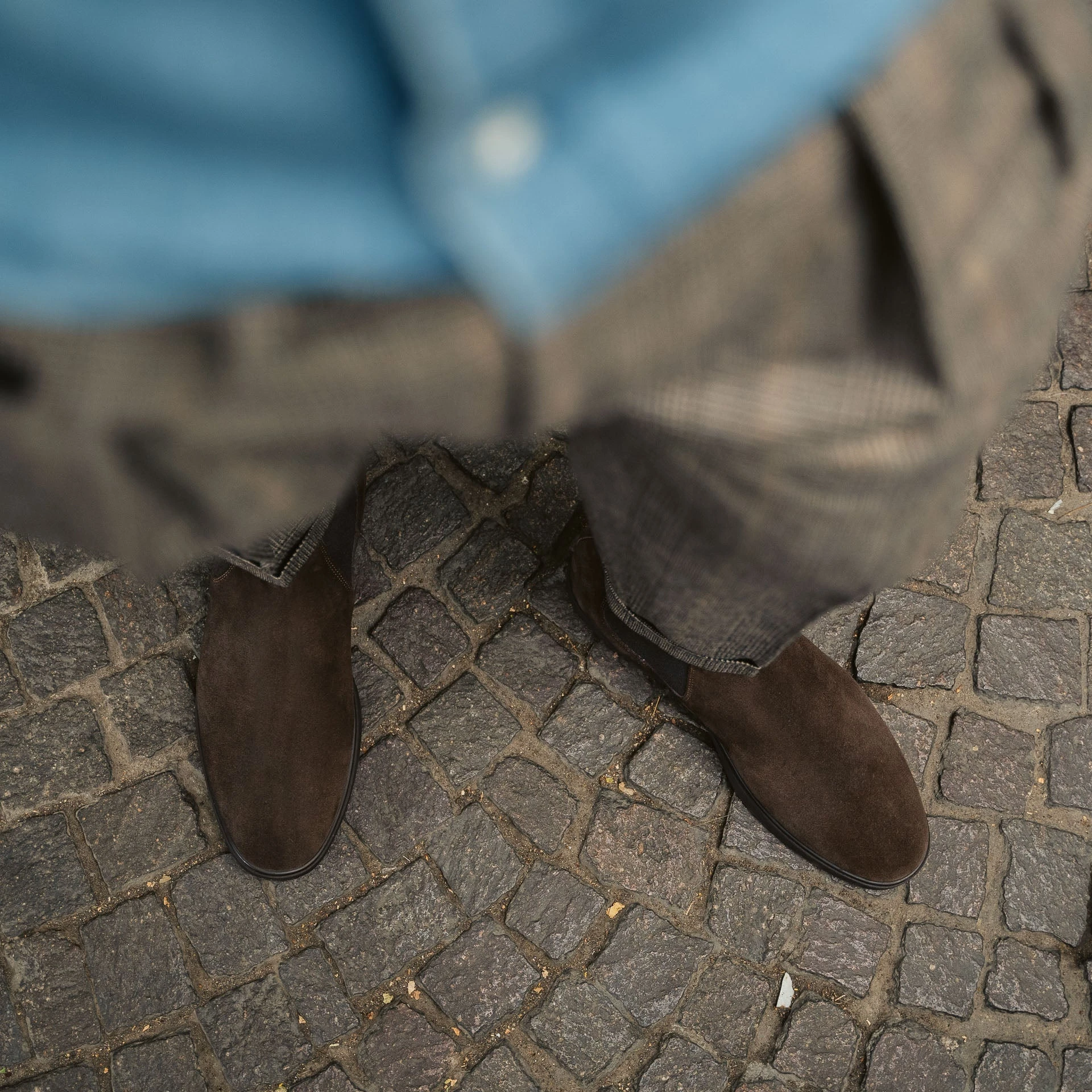 The [sbrand] Classic Suede Chelsea Boots are the iconic choice for any man who values both style and practicality. Made from luxurious suede leather and featuring a durable rubber sole with ridges, these boots are designed for walking on any surface without slipping. Perfectly versatile, they pair just as well with a suit as they do with casual attire. We styled them with a double-breasted jacket and Prince of Wales flannel pleated trousers for a refined yet casual look.