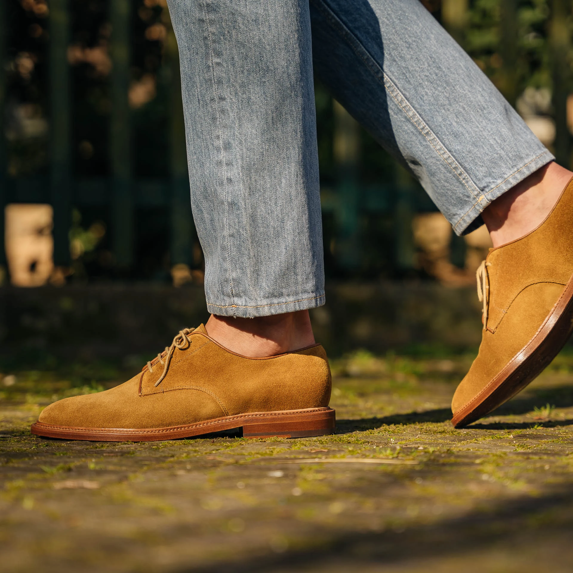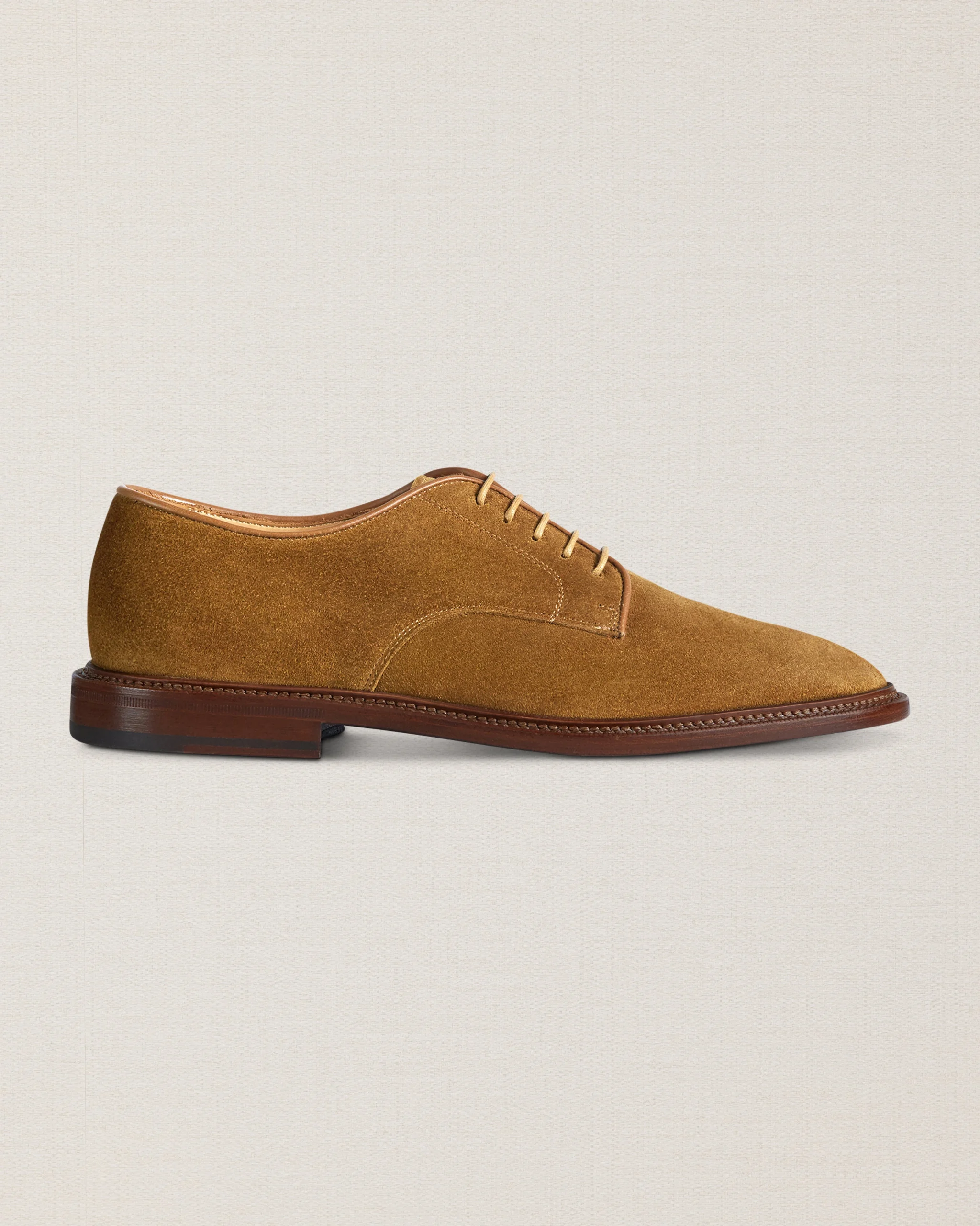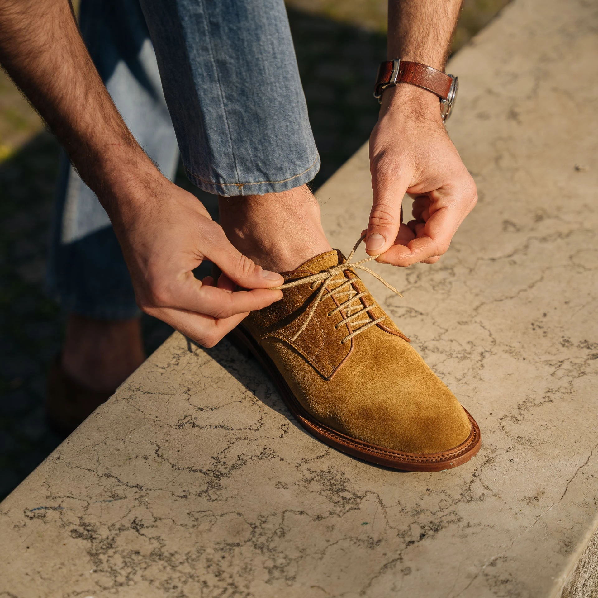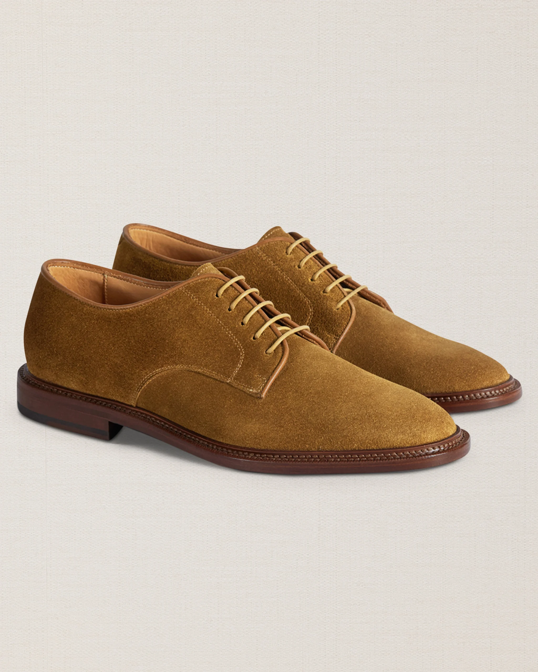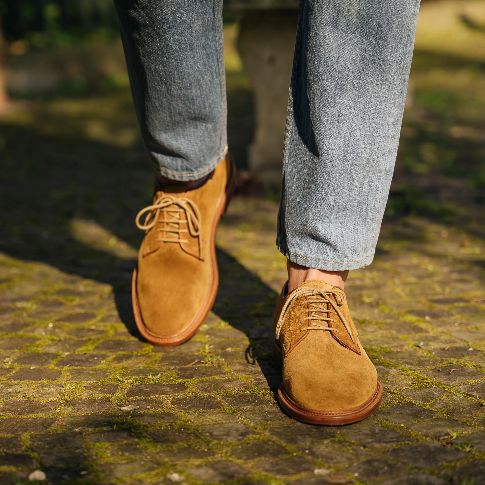 Our Derby with a summer spirit, crafted from suede calfskin and featuring a light leather sole, is perfect for warm days. You can even wear it without socks, thanks to its unlined interior and small leather reinforcement on the heel. Pair it with denim: a Texan-style shirt and light-colored jeans for a stylish, laid-back look.