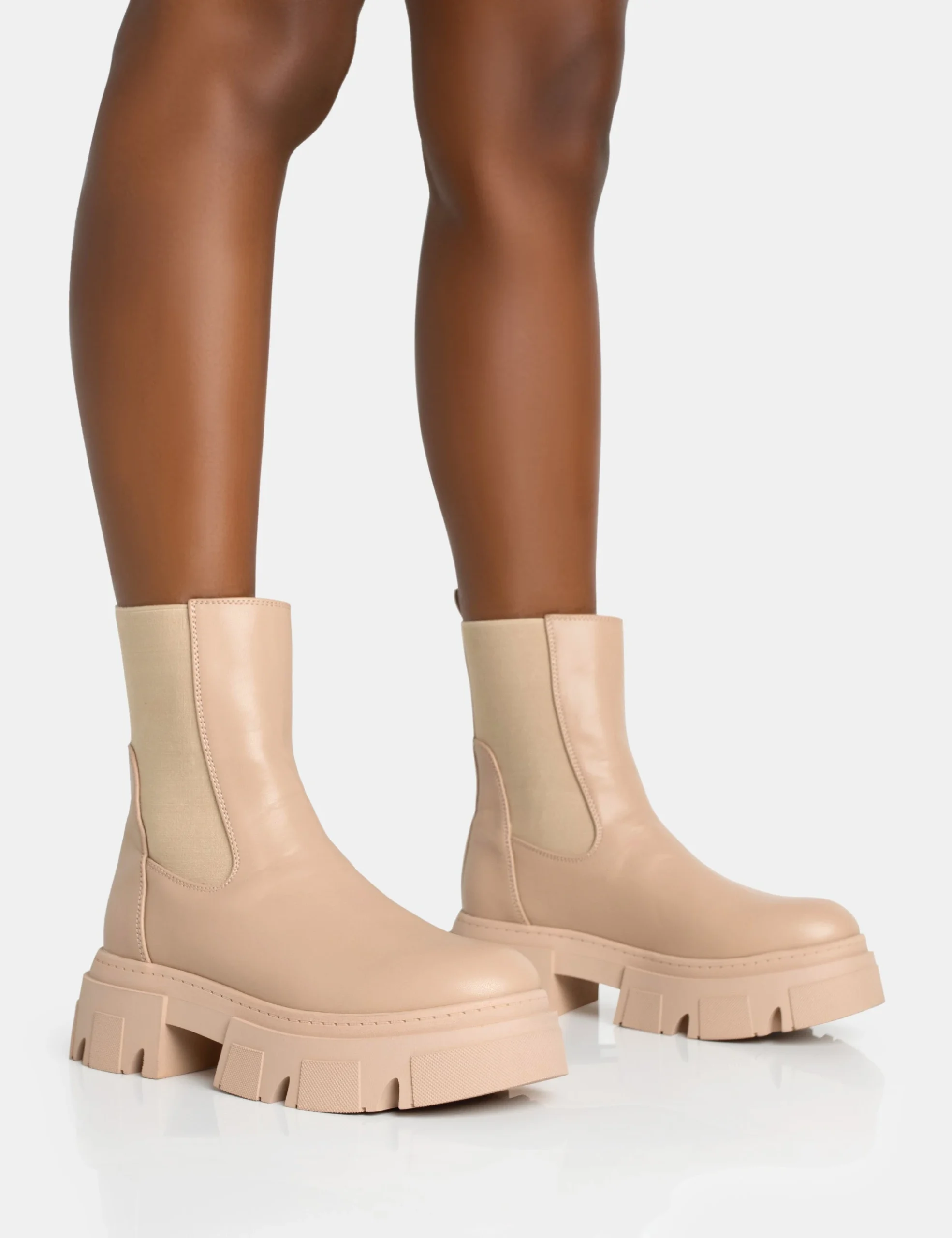 [sbrand] Edgy Taupe Pu Elasticated Ankle Rounded Chunky Sole Ankle Boots