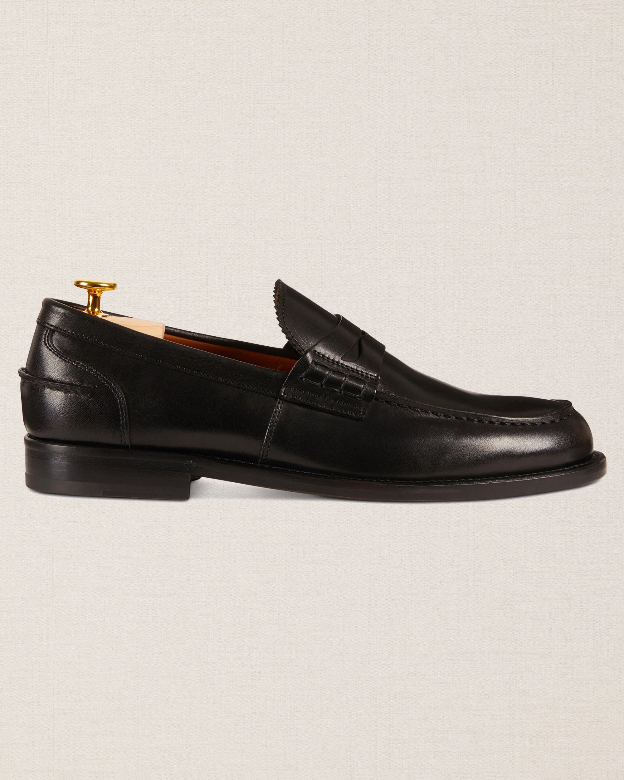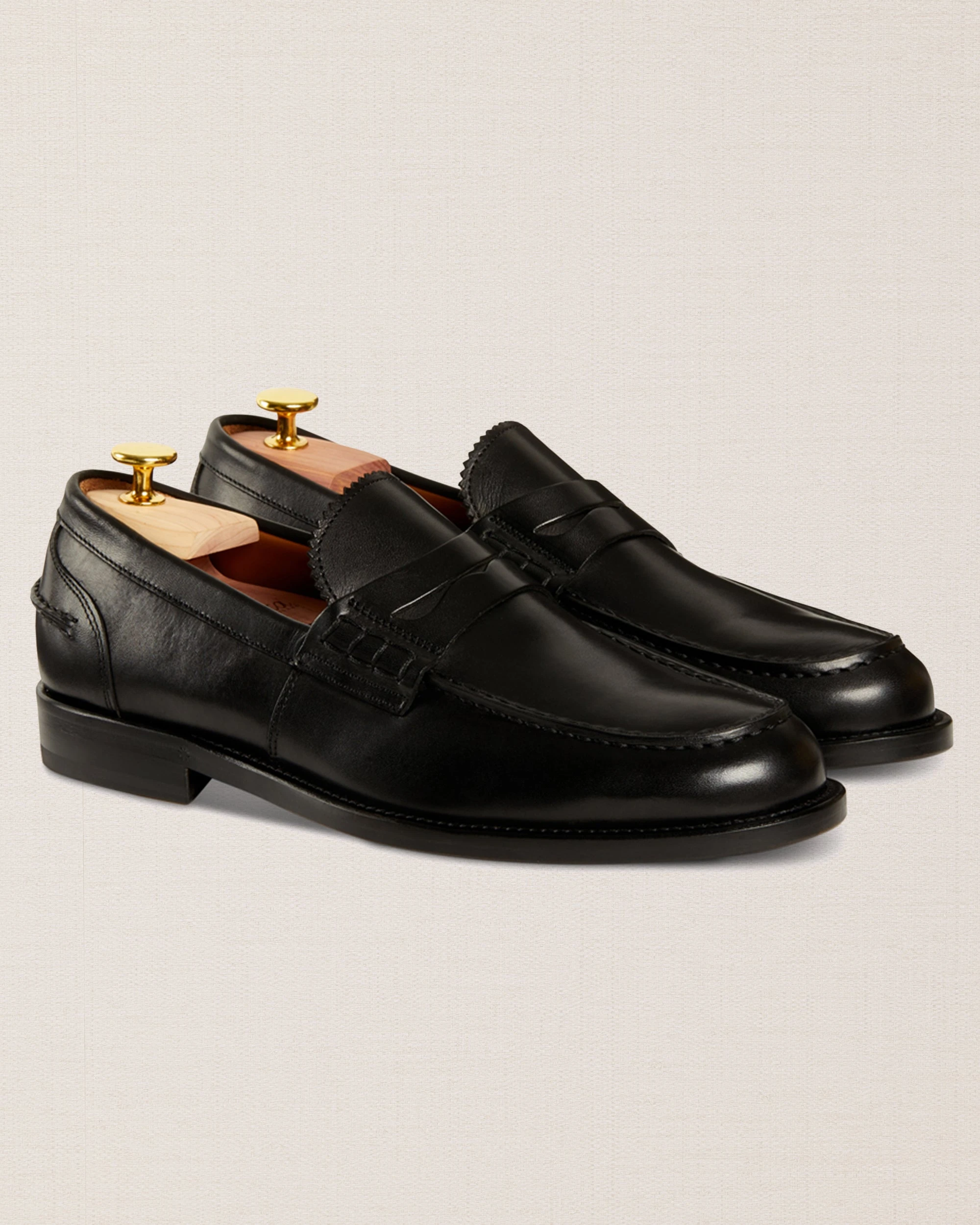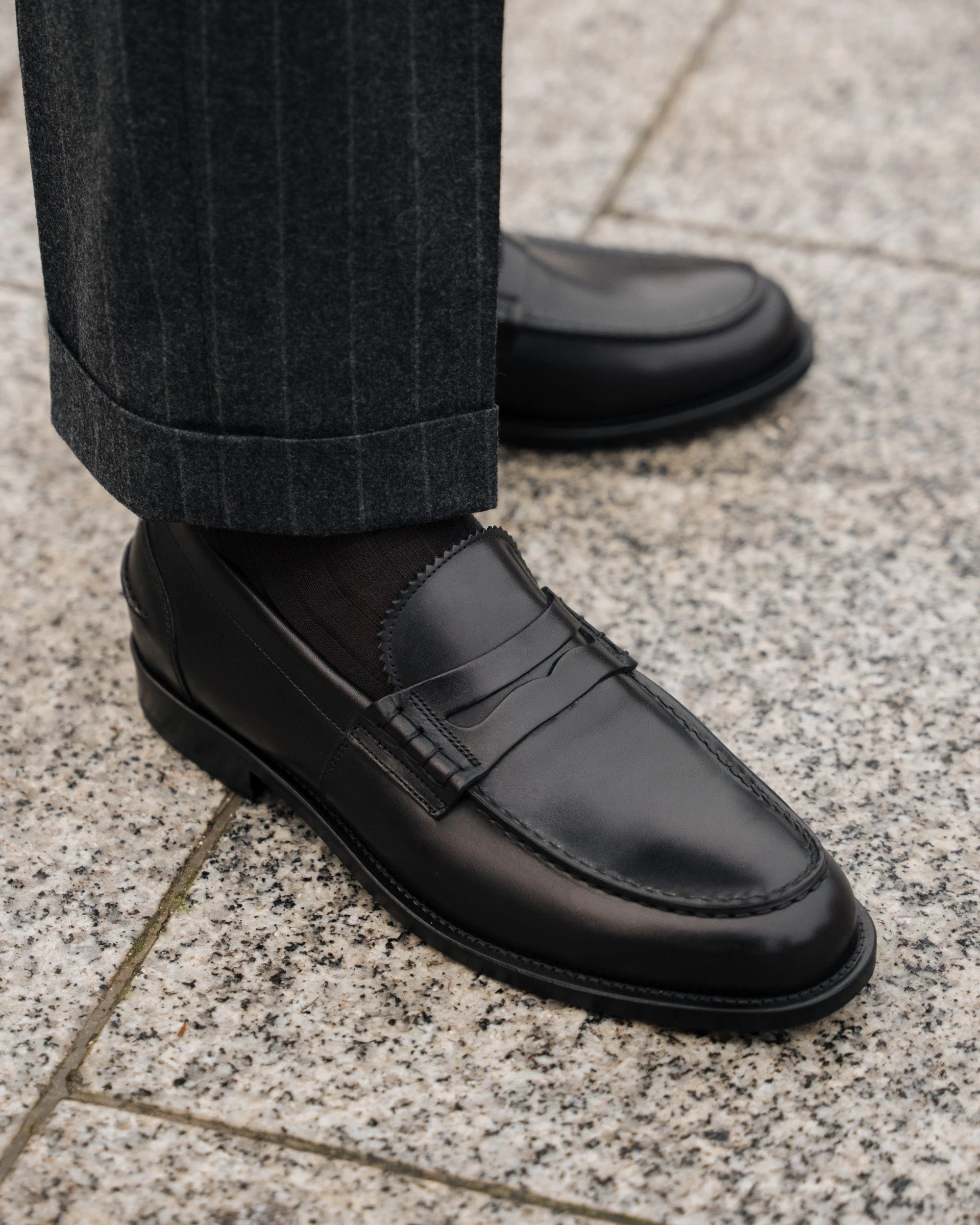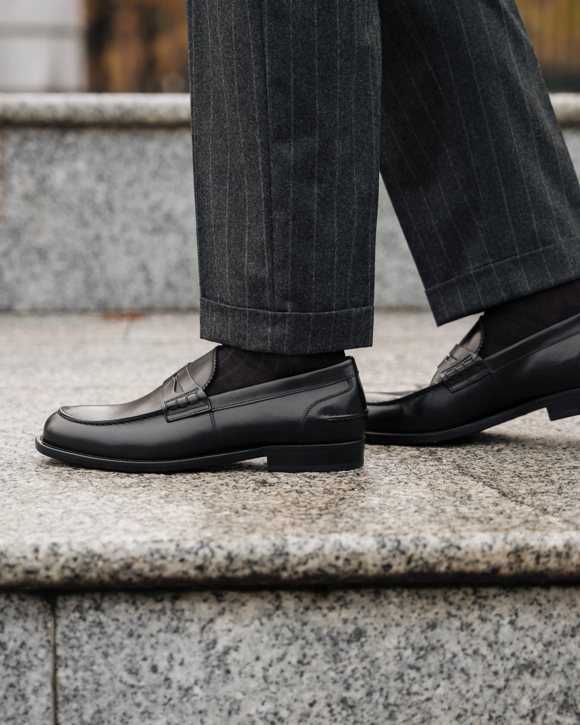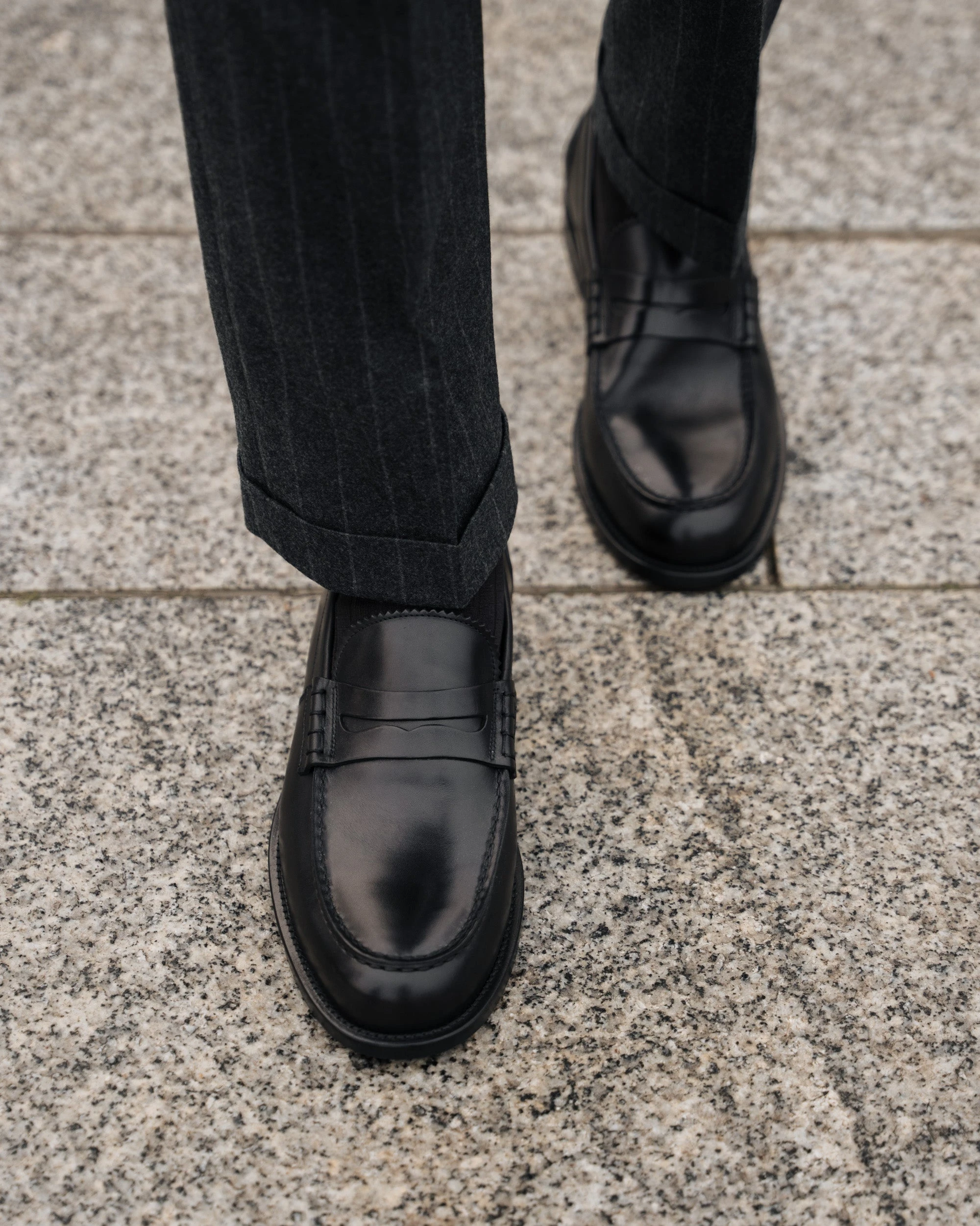 It’s a Penny Loafer designed for the mature gentleman who works on the top floor of an international corporation. Featuring a rounded shape with no bindings, this loafer exudes elegance. Crafted with polished binder leather and a leather sole, it’s a versatile black shoe that pairs perfectly with your suit at work or with casual wear at the park on Sundays. Extremely light and comfortable, it offers a slip-on design that lets you wear them like slippers.