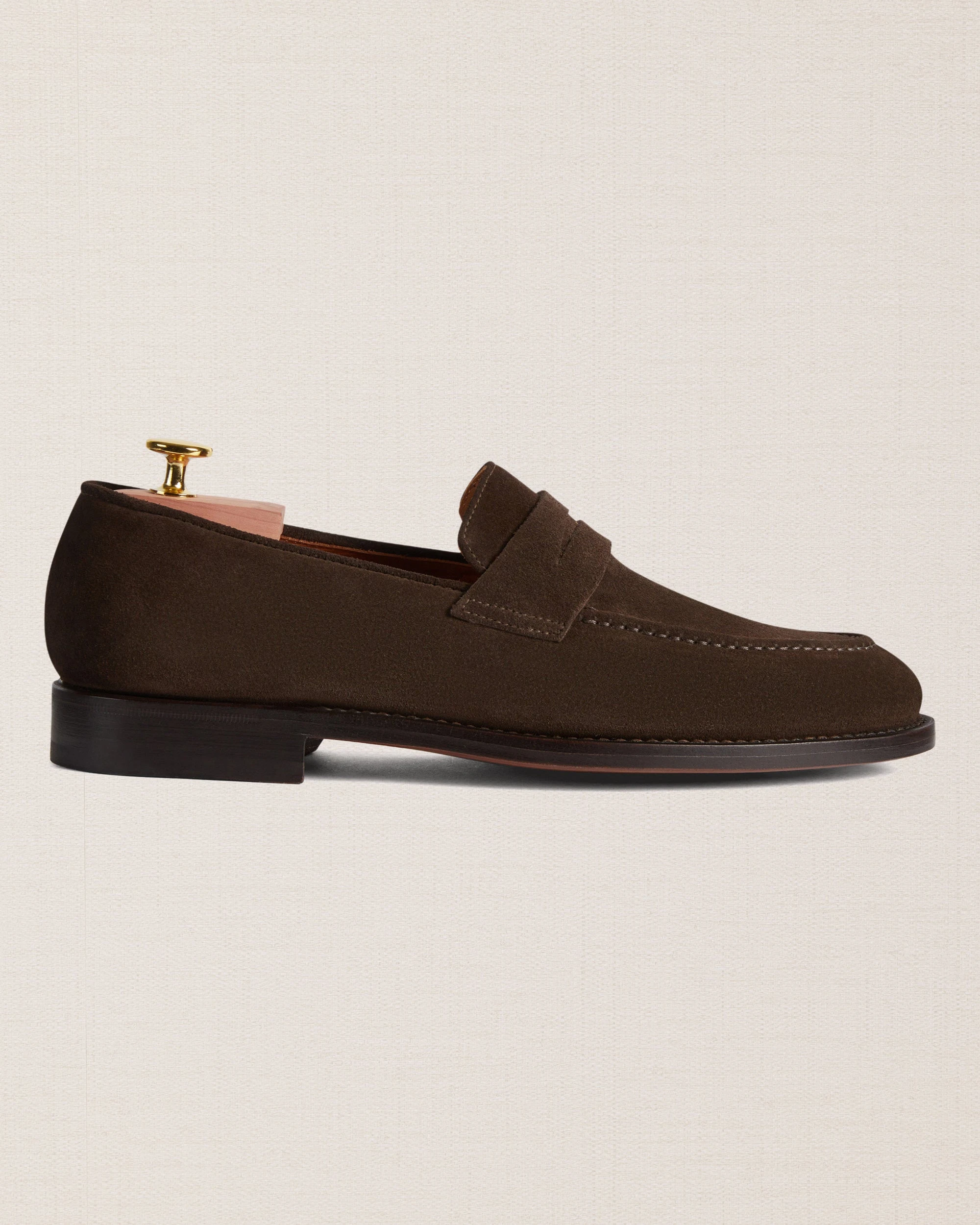 It’s a Penny Loafer that acts like a Tassel Loafer, blending the best of both styles. With a very tapered shape and the blake-rapid construction, the most refined on the market, this loafer is a versatile choice. Made with water-resistant suede leather and a leather sole, it’s the dark brown shoe for the man who values both flexibility and charm.