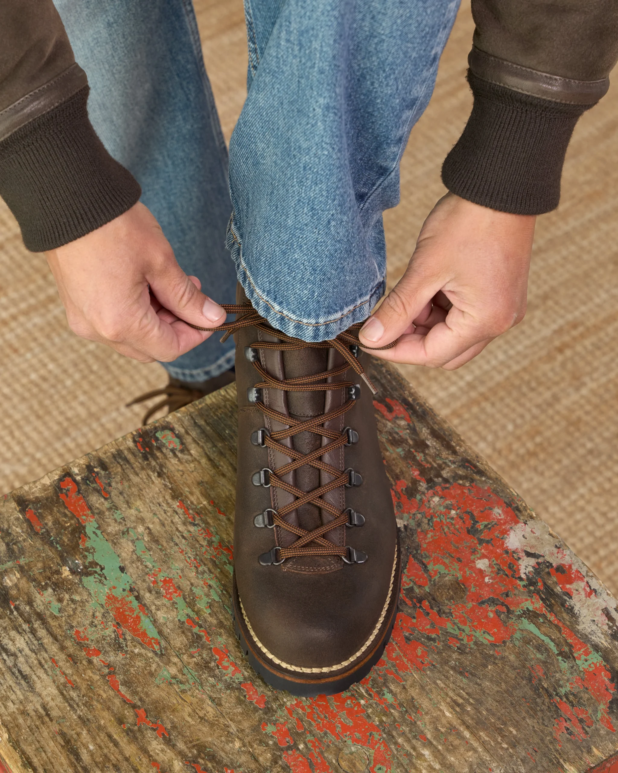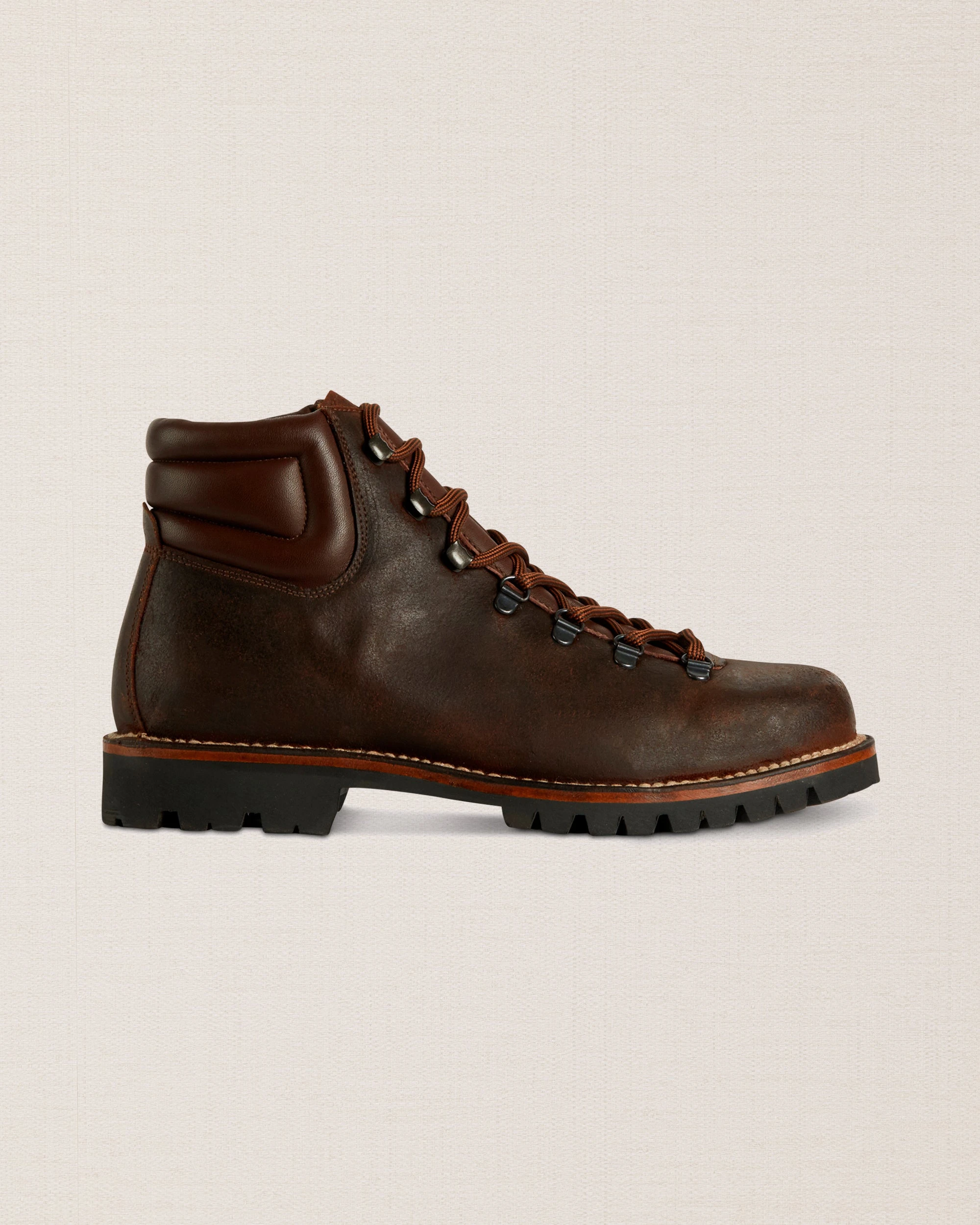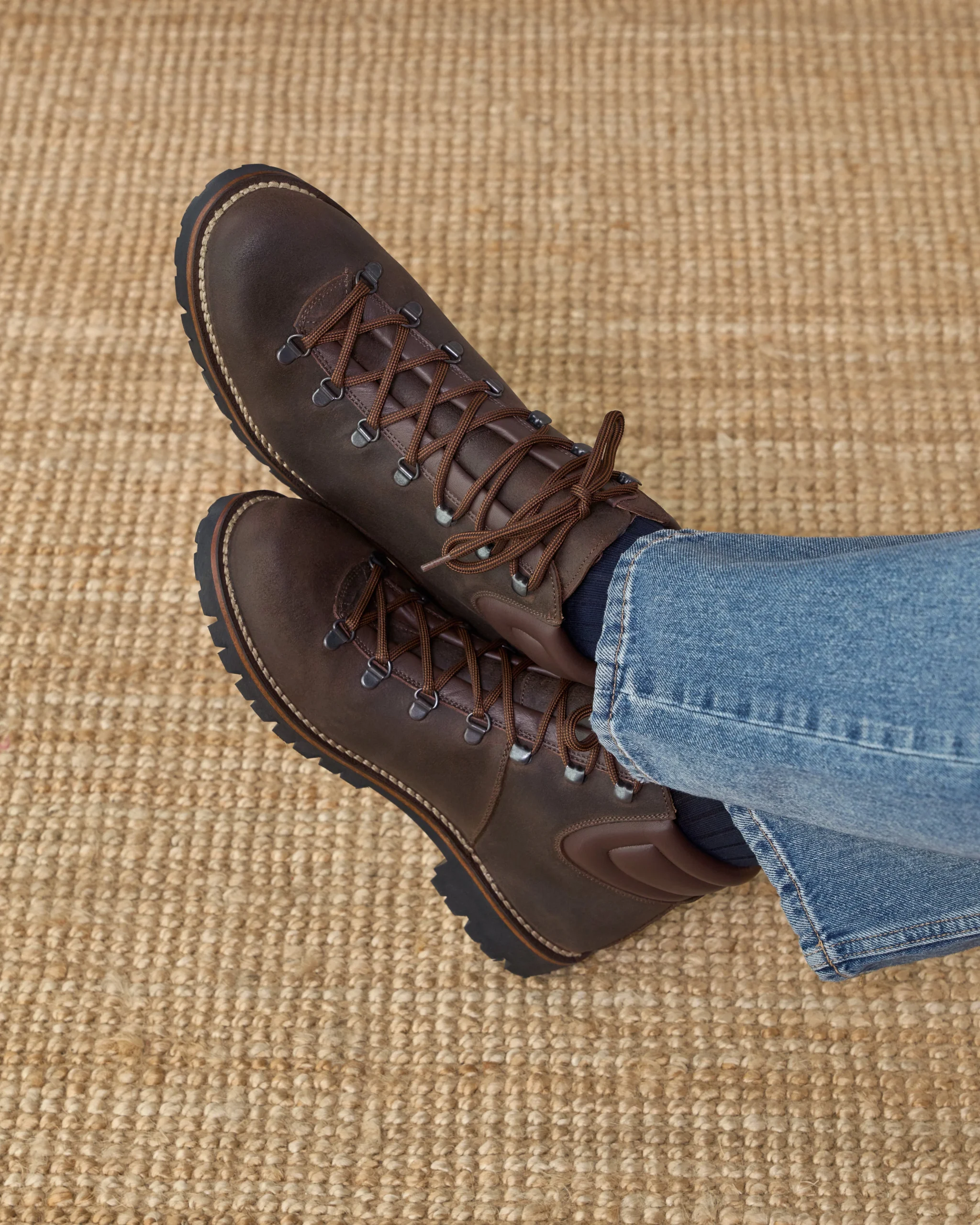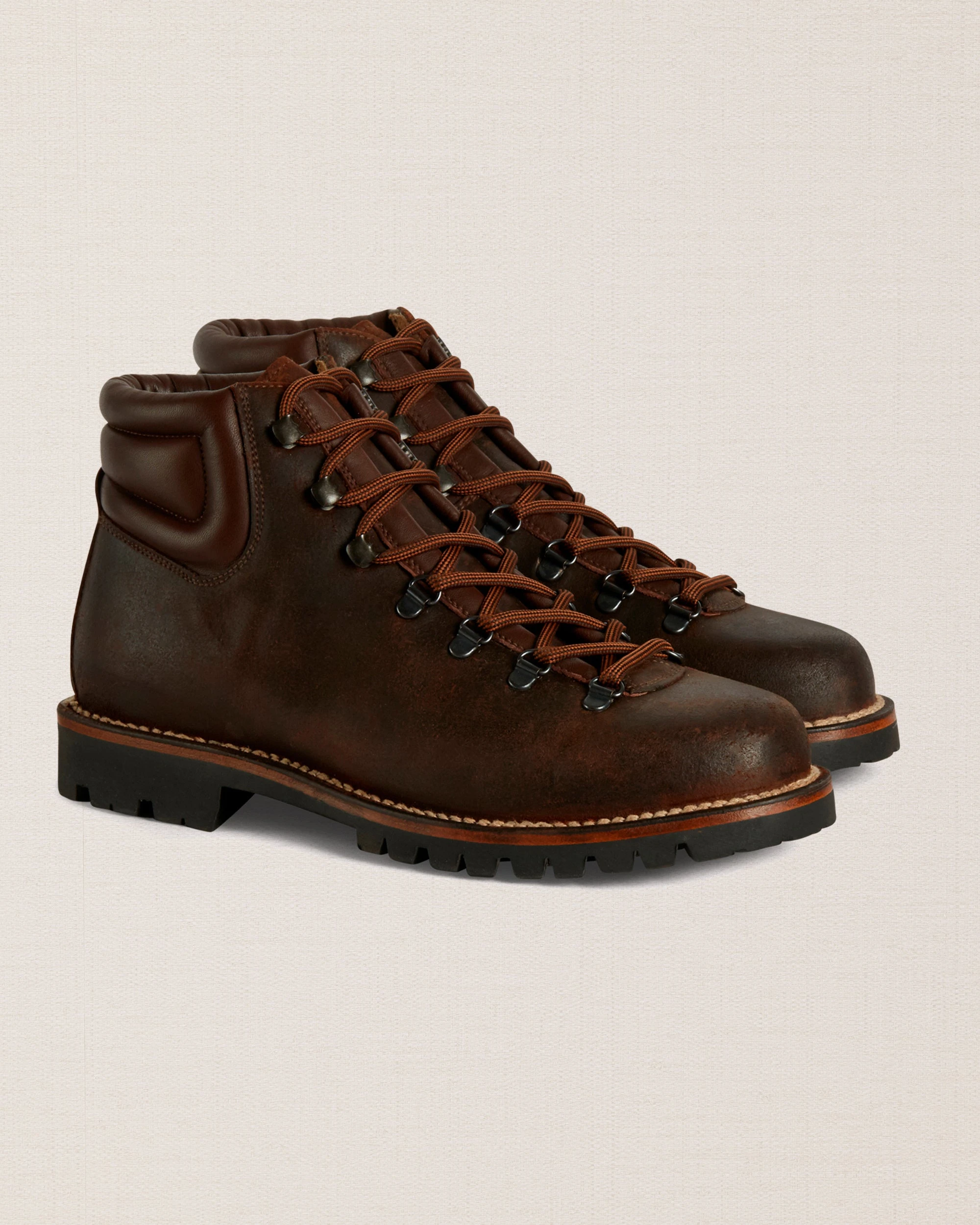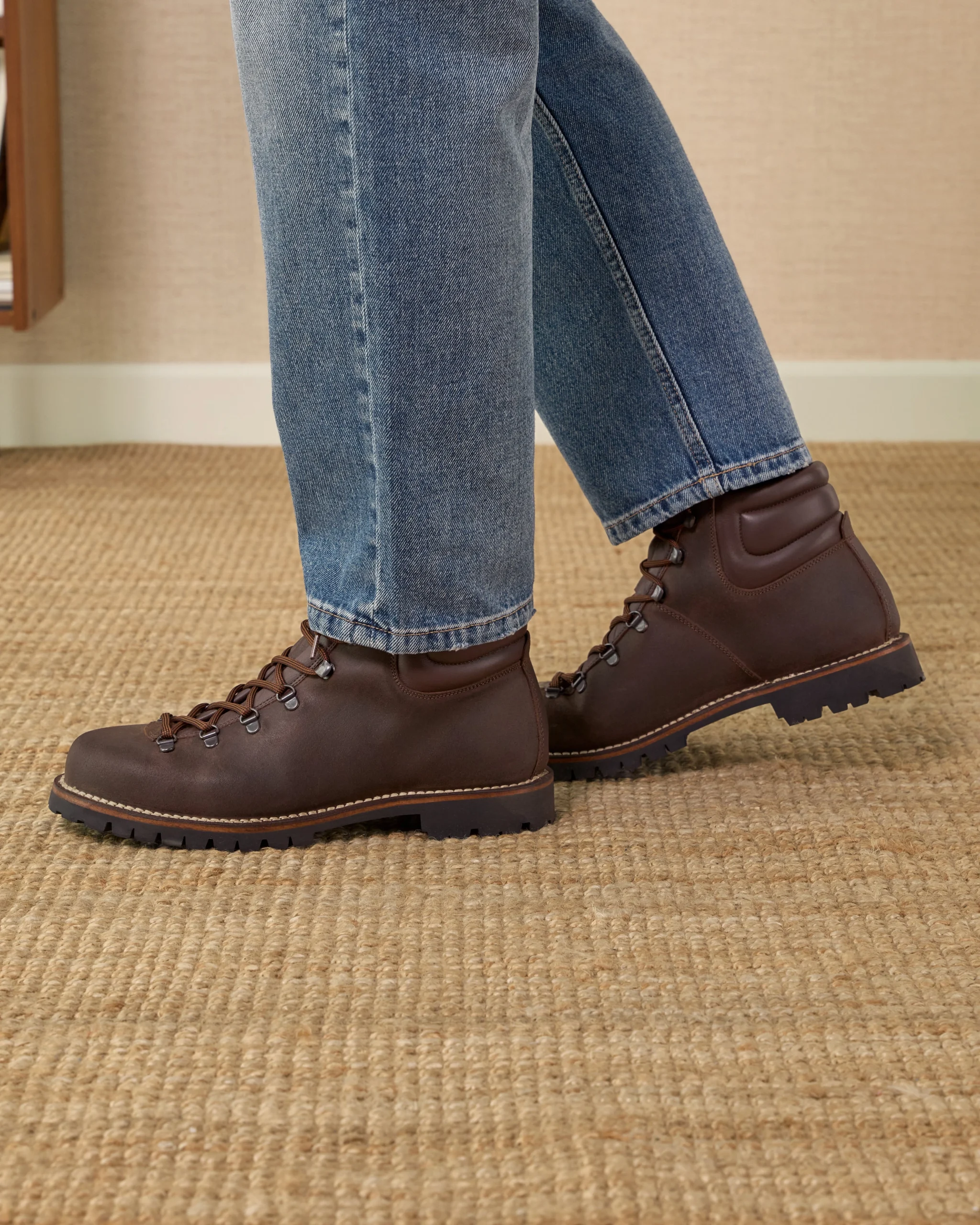 The [sbrand] Waterproof Suede Hiking Boots are inspired by mountain life, designed to keep you comfortable and protected during your winter adventures. Made from dark brown greased suede, these solid and enveloping ankle boots feature a membrane between the lining and leather, enhancing their water resistance. The tongue is a single piece, providing additional protection from rain. Adorned with two-tone shoelaces and visible stitching, these boots combine style and functionality. Pair them with cream-colored moleskin trousers, a water-colored turtleneck, and a cozy mutton jumper for a perfect winter look.