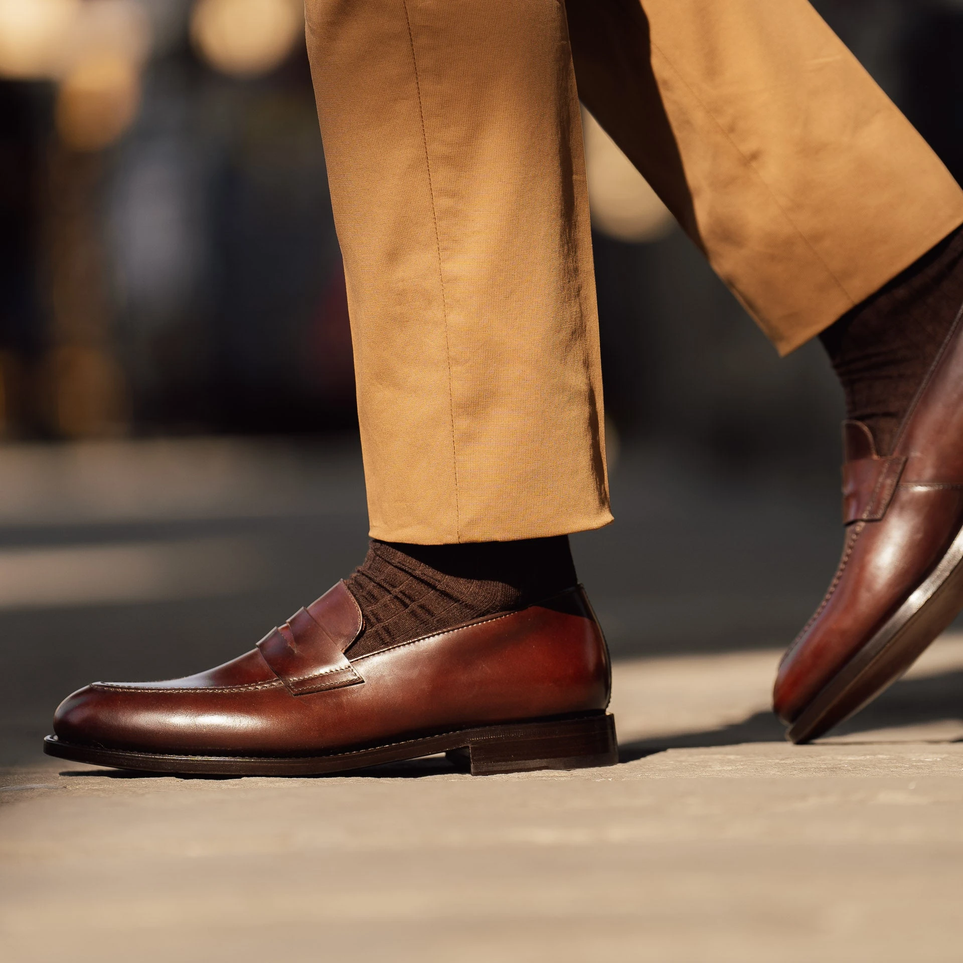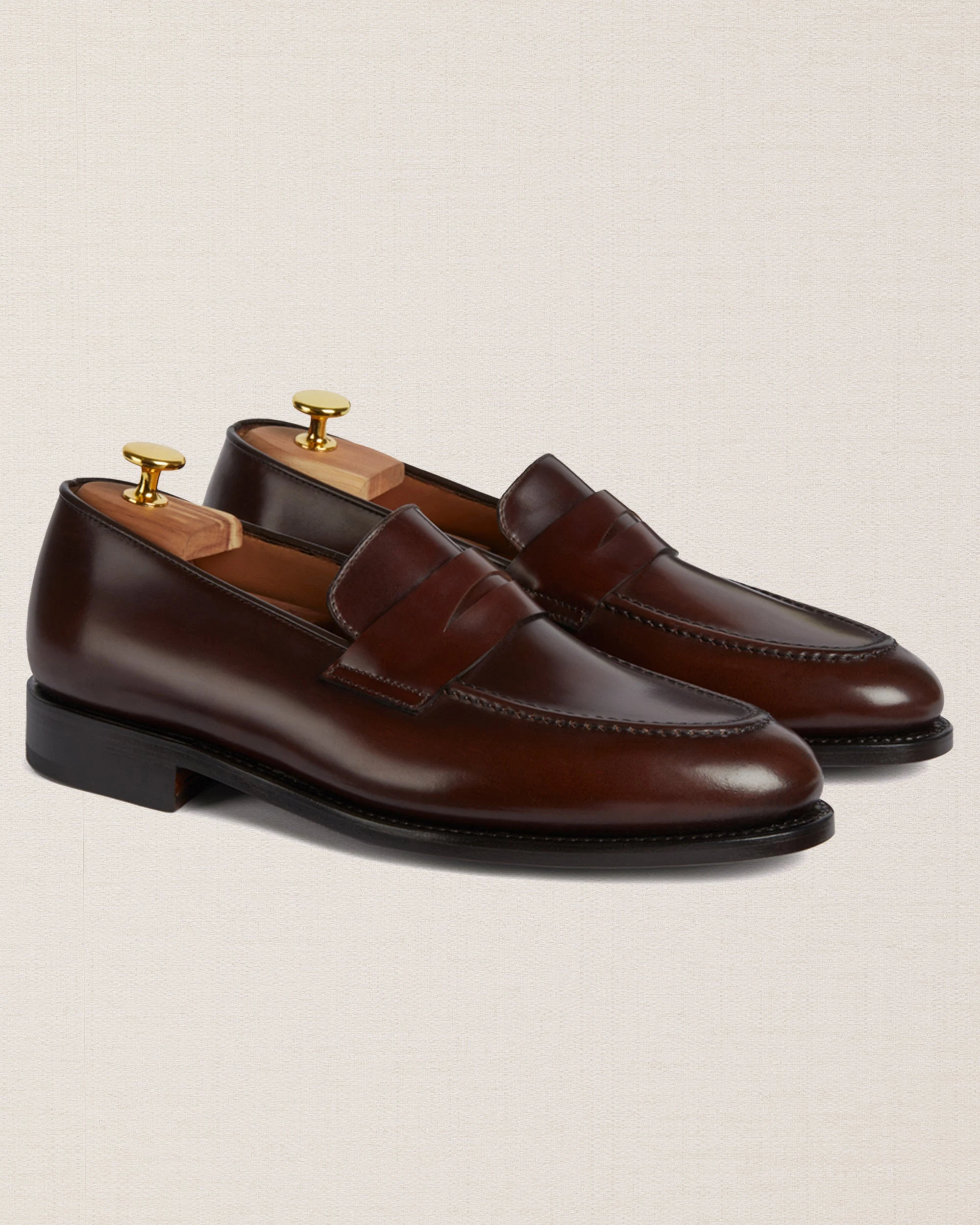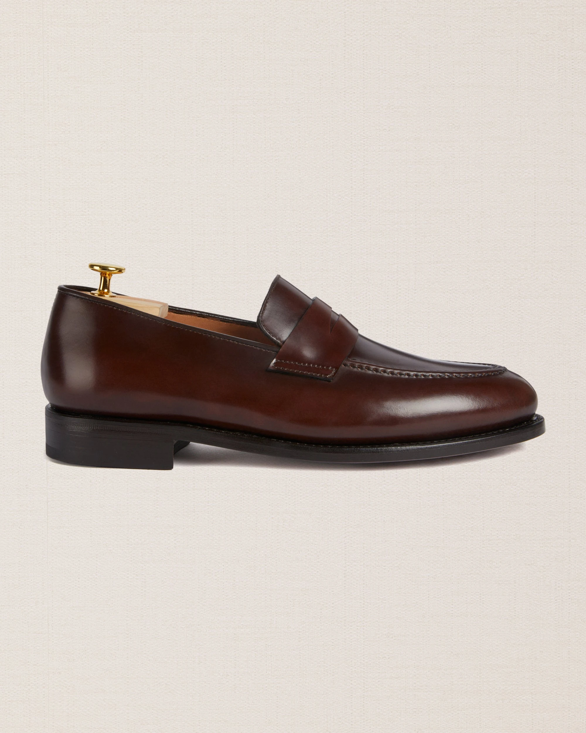 Artisanal Tapered Penny Loafers in dark brown cordovan with a waxed leather sole, perfect for either tailored suits or more casual outfits. Completed using the Goodyear method, they are made to be long-lasting and durable. The leather is among the finest, requiring slow and precise working techniques, capable of enhancing the raw material. They are made with you in mind; a connoisseur who wants footwear that’s timeless – in all senses of the word.