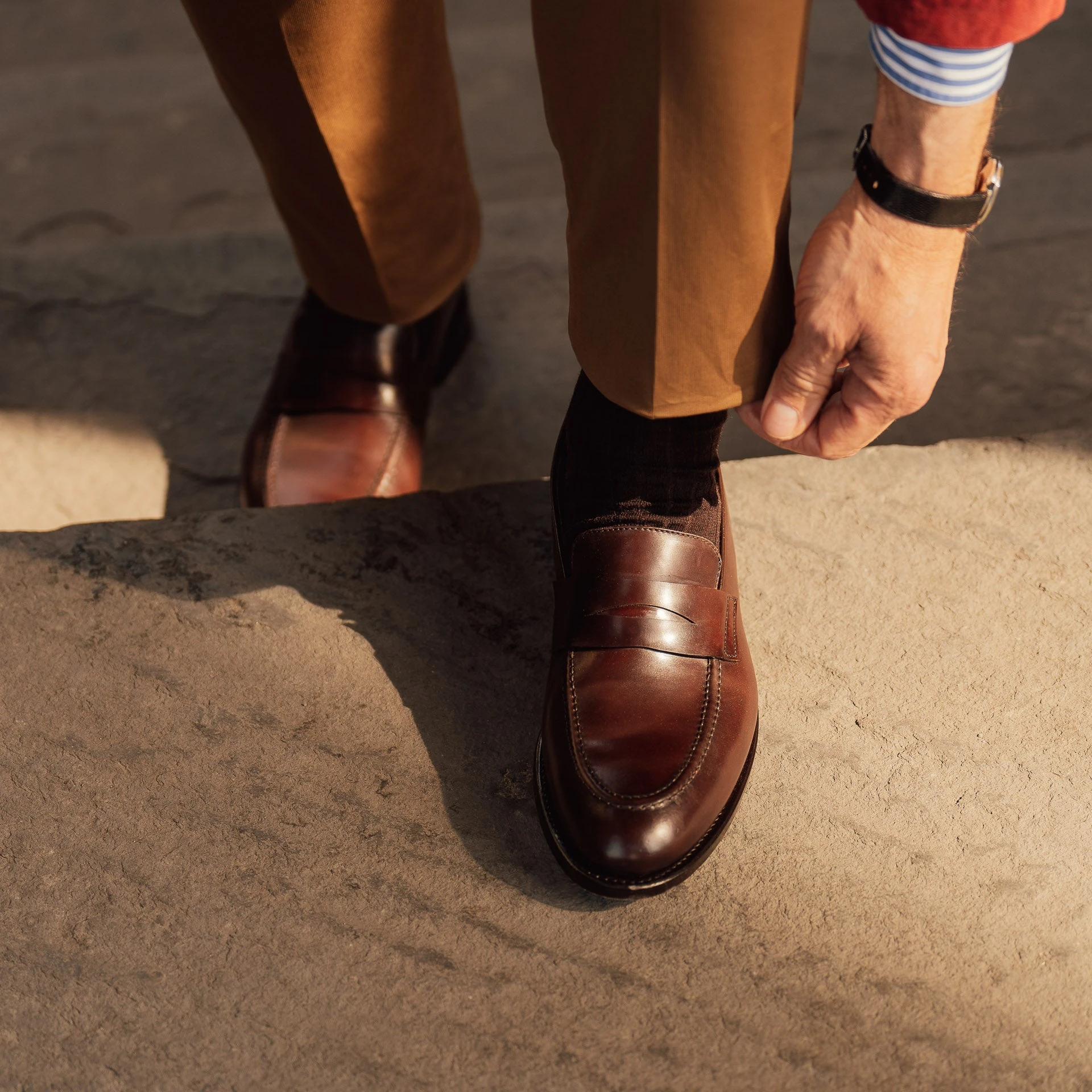 - Material: Dark brown cordovan with waxed leather sole